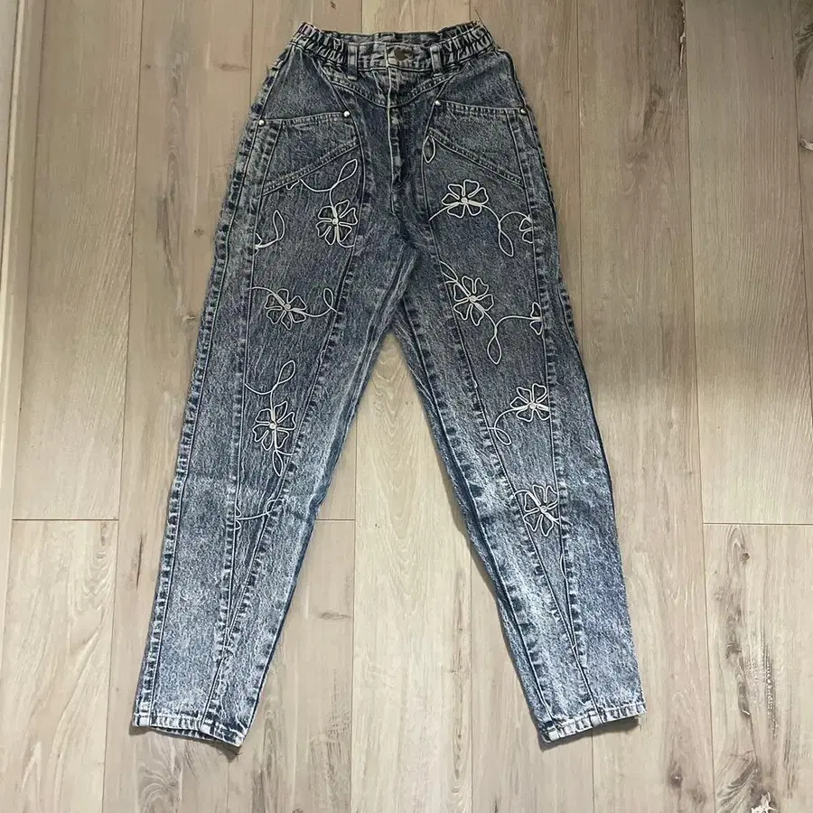 구제 의류 플라워 자수 하이웨스트 케미컬 워시 데님 팬츠