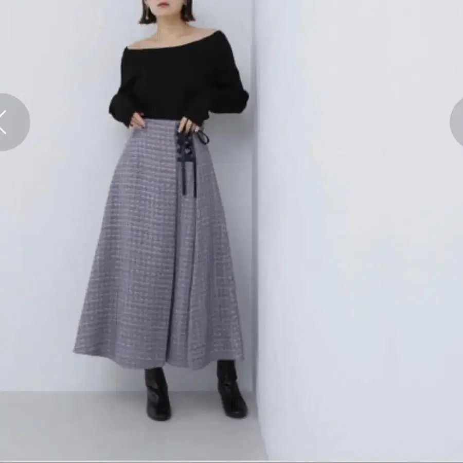 겨울 계절에 딱 맞는 트위드 x 레이스업 디자인이 성숙/러블리한 스커트입니다. 약간 라벤더 빛이 도는 블루 색상으로 매우 아름다운 컬러입니다.