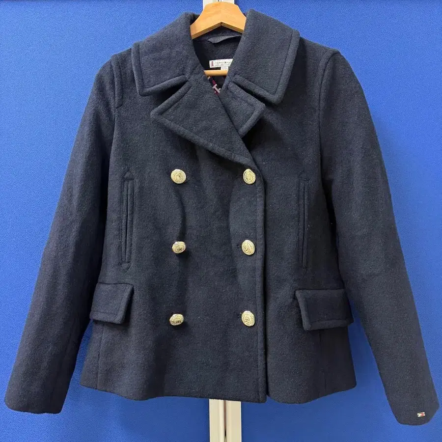 더블 브레스트의 네이비 울 코트, 패턴이 들어간 안감이 특징입니다.