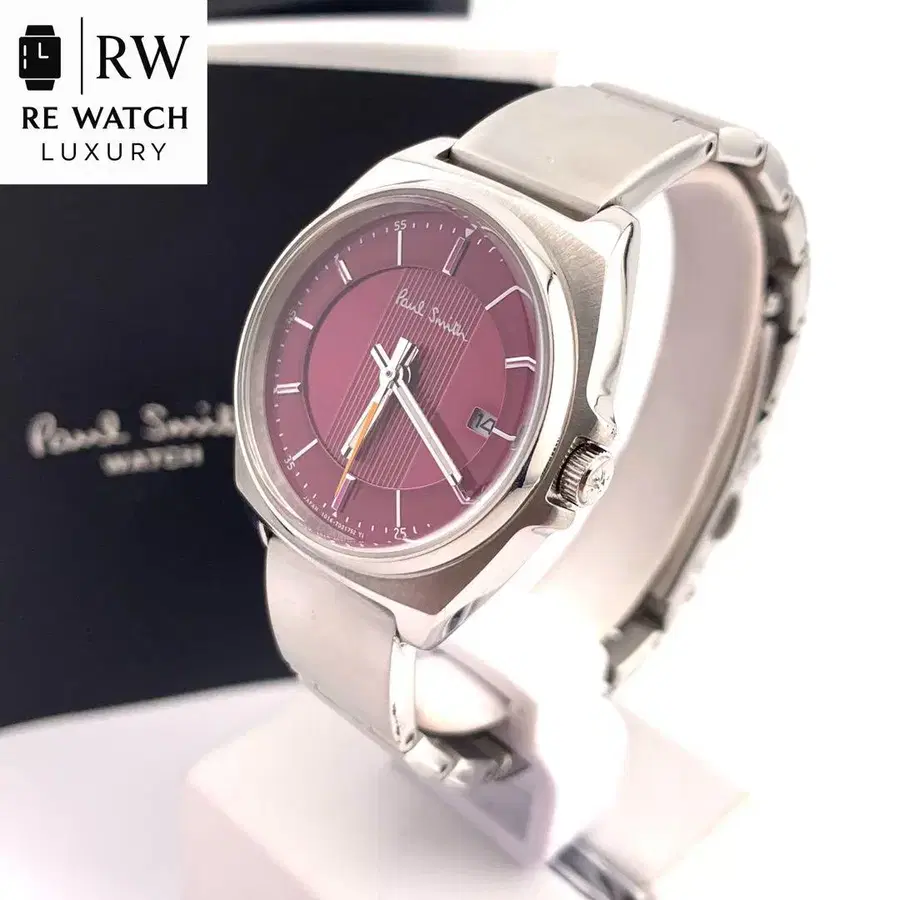 퍼플 다이얼과 스테인리스 스틸 밴딩을 갖춘 쿼츠 손목시계. - 브랜드: Paul Smith - 색상: 퍼플 - 소재: 스테인리스 스틸 - 기능: 날짜 표시 - 디자인: 쿼츠식 - 부속품 - 상자 - 케이스/직경 - 약 28mm - 팔 둘레 - 약 14.5cm - 흠집, 깨짐 등 - 있음 - 간단한 청소 완료 - 작동 - 새 배터리 교체 완료, 작동 양호, 보통 사용 방문해 주셔서 감사합니다.