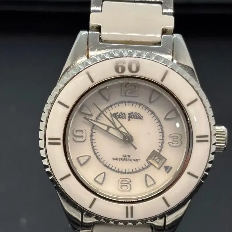 화이트의 라운드 다이얼과 회전 베젤을 갖춘 쿼츠 손목시계.