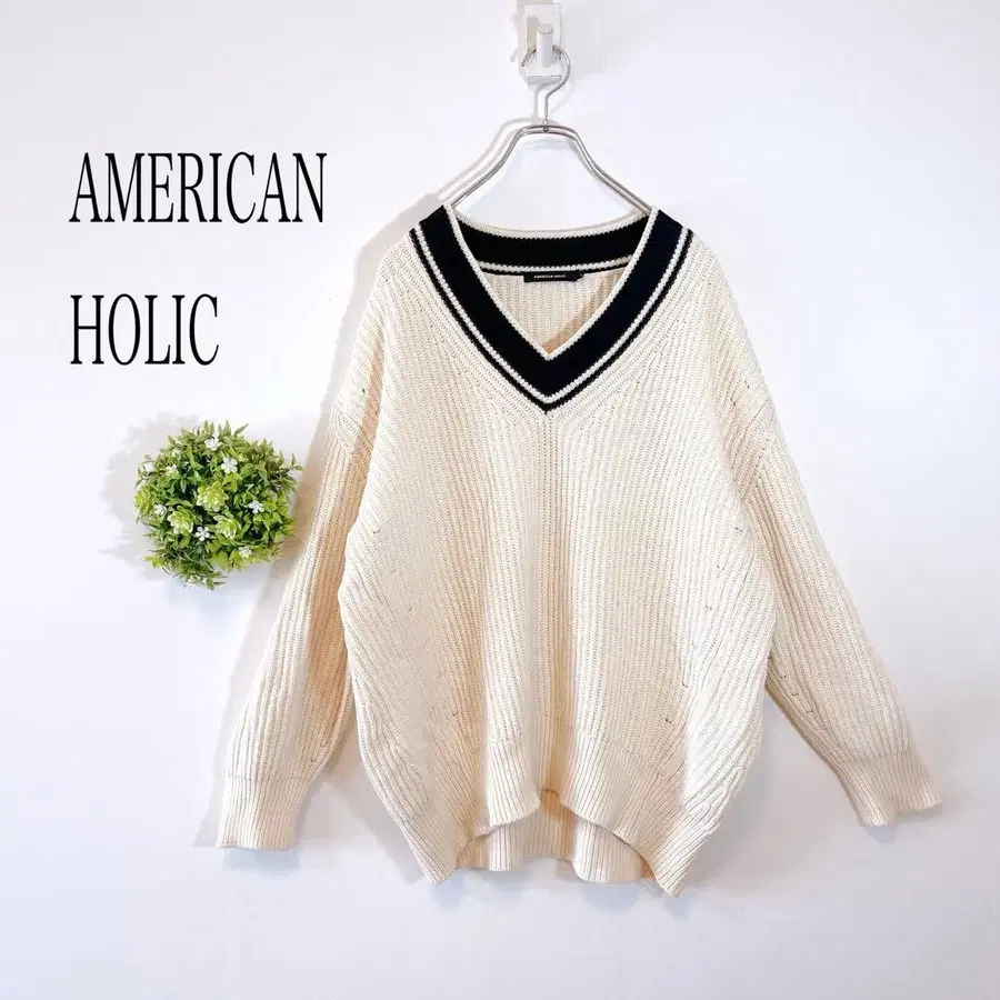아메리칸 홀릭 [ L ] V넥 니트 오버 사이즈 화이트 블랙