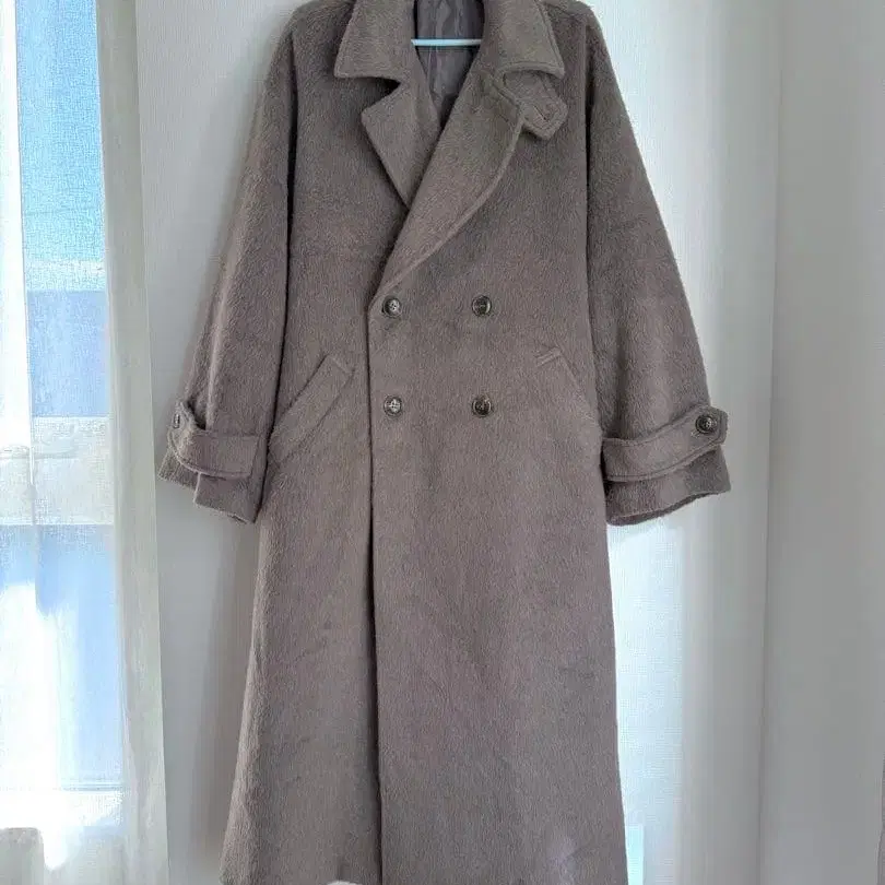 더블 브레스트 디자인의 베이지색 롱 코트입니다. 허리 벨트가 있어 스타일리시합니다.