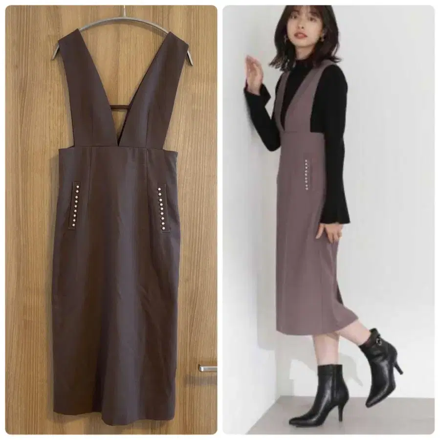 사이드에 펄 버튼이 장식된 브라운의 타이트 원피스.