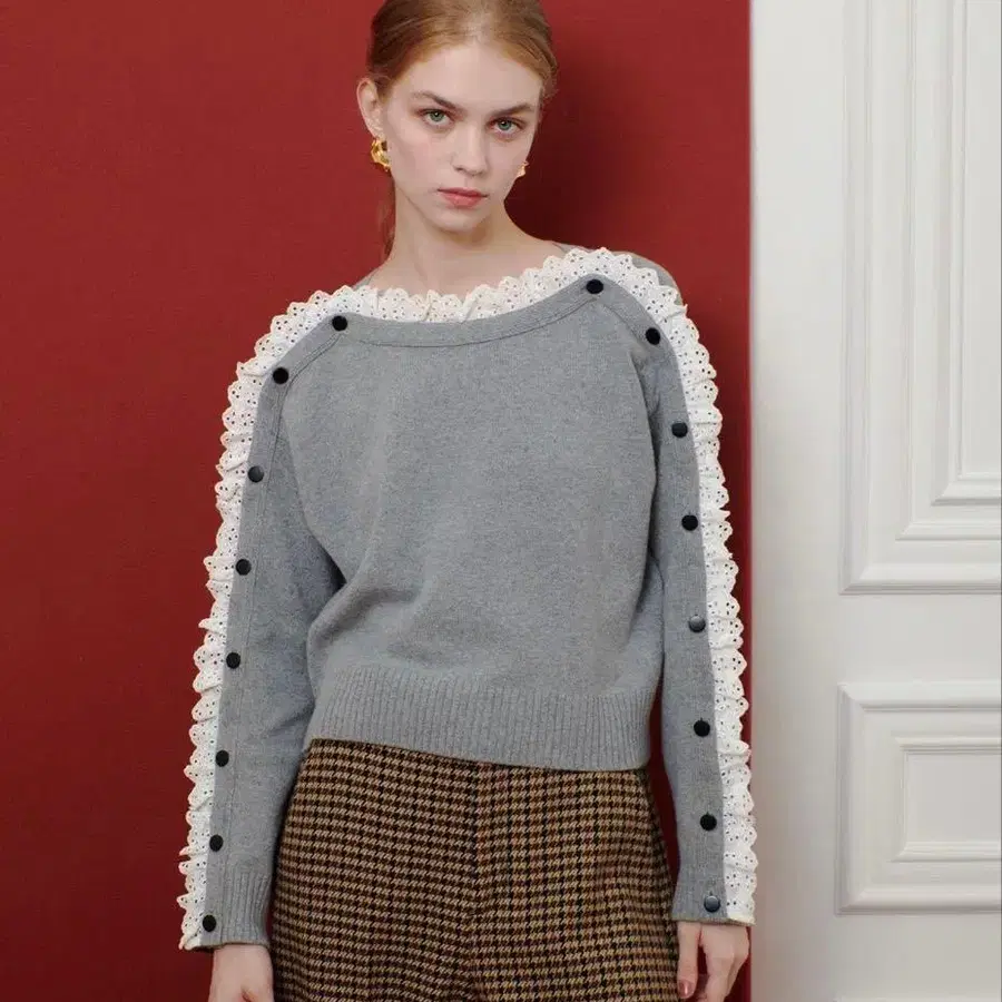 소매부터 넥라인까지 코튼 레이스를 트리밍하고 버튼 디자인을 더한, 한 장만으로도 주인공이 될 수 있는 니트.