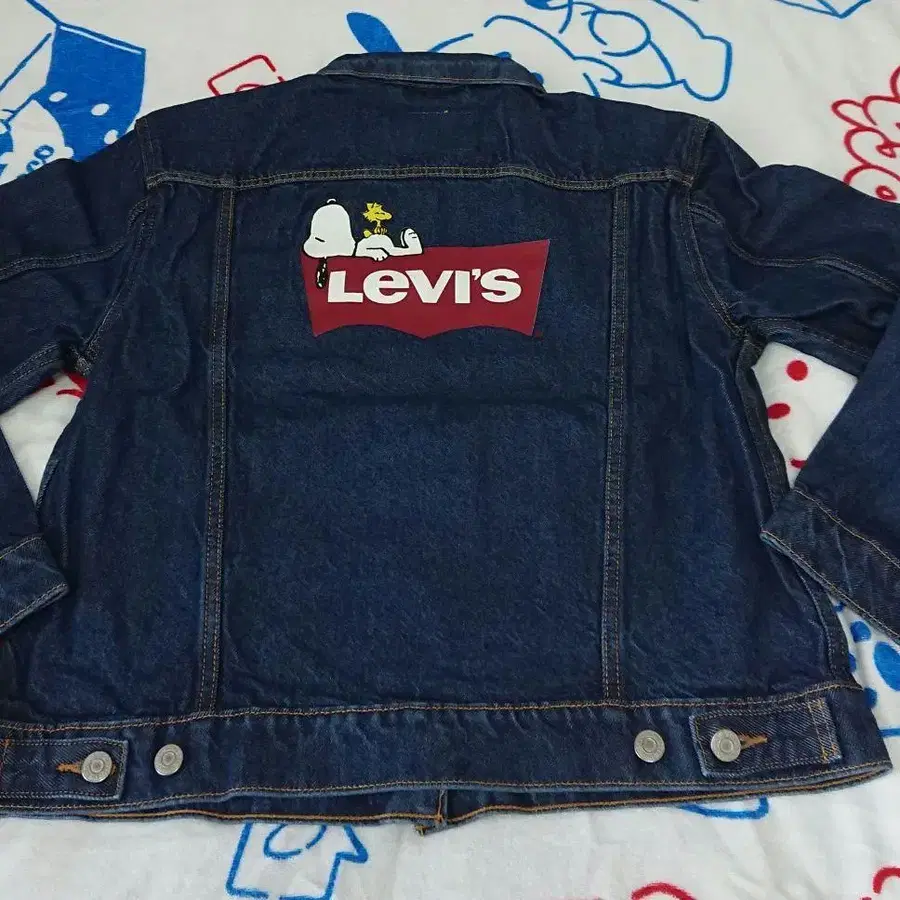 스누피와 우드스탁 자수가 들어간 Levi's의 인디고 데님 자켓. - 브랜드: Levi's - 디자인: 스누피와 우드스탁 자수 - 색상: 인디고 - 스타일: 데님 자켓