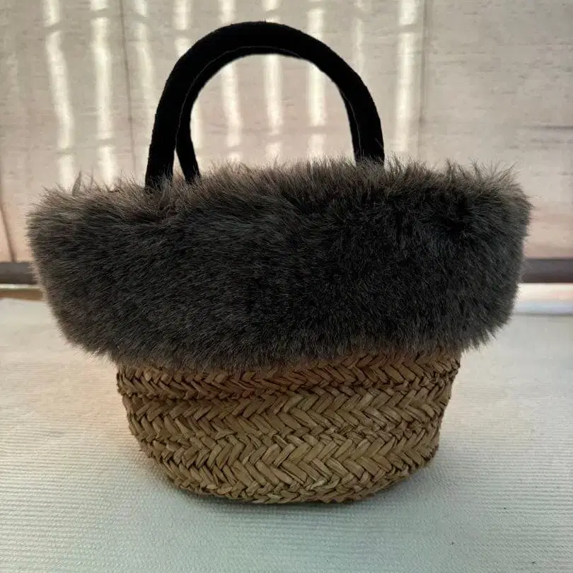 그레이 색상의 퍼가 바스켓백에 달려 있으며