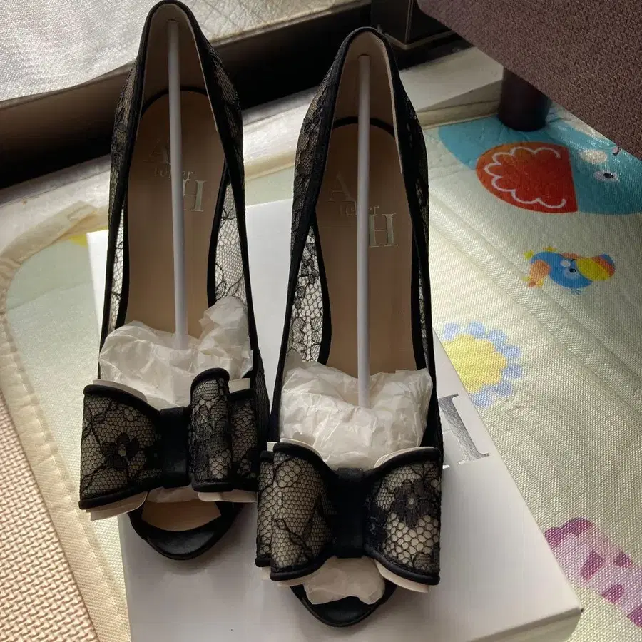 레이스 소재와 리본이 특징인 오픈토 하이힐. - 색상: 블랙 - 디자인: 레이스 소재, 리본 포함 - 굽 높이: 하이힐 (9cm) - 스타일: 오픈토 방문해 주셔서 감사합니다. 미사용이지만 사진 4번째 장의 화살표 리본 부분이 약간 직각으로 접힌 부분이 있습니다. 이해해 주시면 감사하겠습니다. 잘 부탁드립니다.
