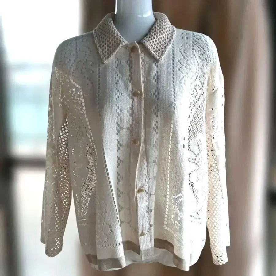 아이보리 색상의 레이스 편직 디자인 긴팔 상의, 메쉬 옷깃으로 엘레강트한 인상을 줍니다. - 색상: 아이보리 - 디자인: 레이스 편직 - 스타일: 버튼 부착 - 옷깃 디자인: 메쉬 옷깃 - 소매 길이: 긴팔 방문해 주셔서 감사합니다. 아오모리현 고쇼가와라 ELM 내 셀렉샵에서 구매한 것입니다. 미사용품입니다.