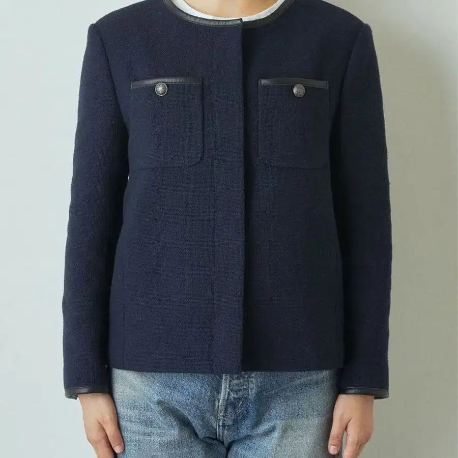 컴팩트한 사이즈감과 노카라 디자인이 클래시컬한 무드의 자켓은, 데님 등의 캐주얼한 하의와 맞춰 내추럴함을 더하는 스타일링을 추천합니다.