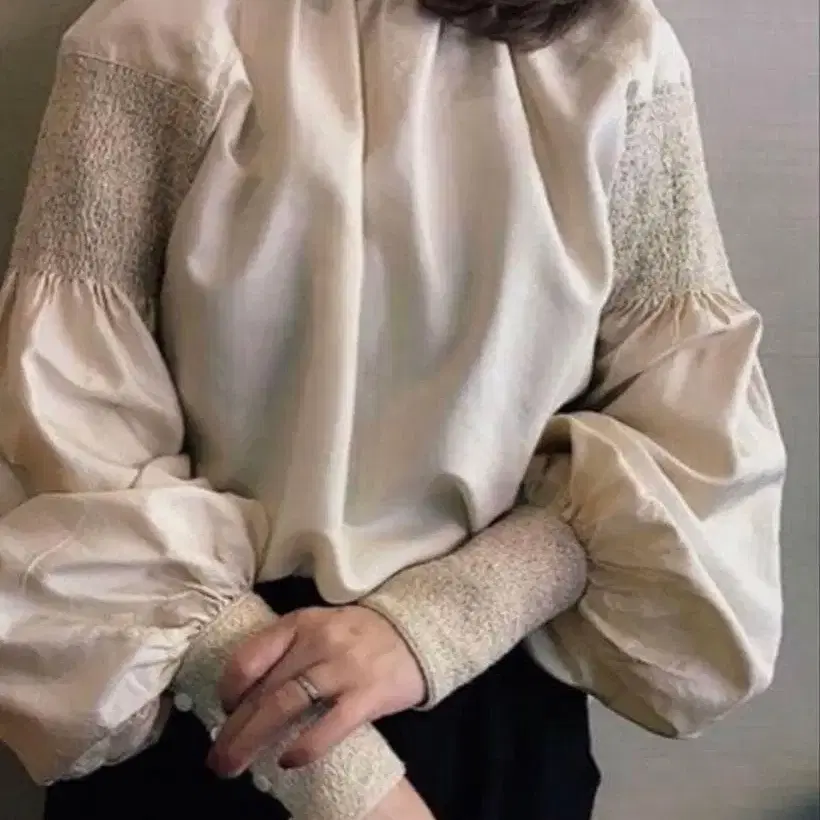 자동 번역되었어요. 원문보기크림색 벌룬 슬리브 블라우스, 부드러운 원단으로 엘레강트한 인상.