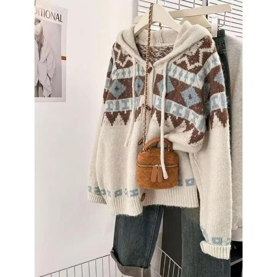 기하학 패턴 후드 니트 스웨터