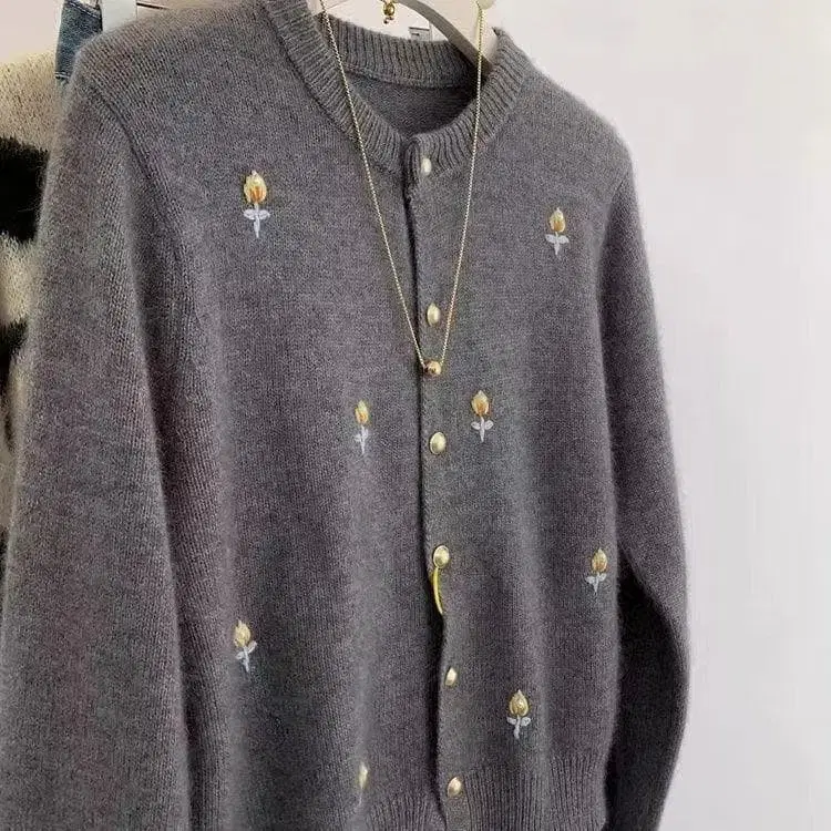• 꽃무늬 입체 자수 플라워 모헤어 혼방 니트 가디건 개성파 복슬복슬