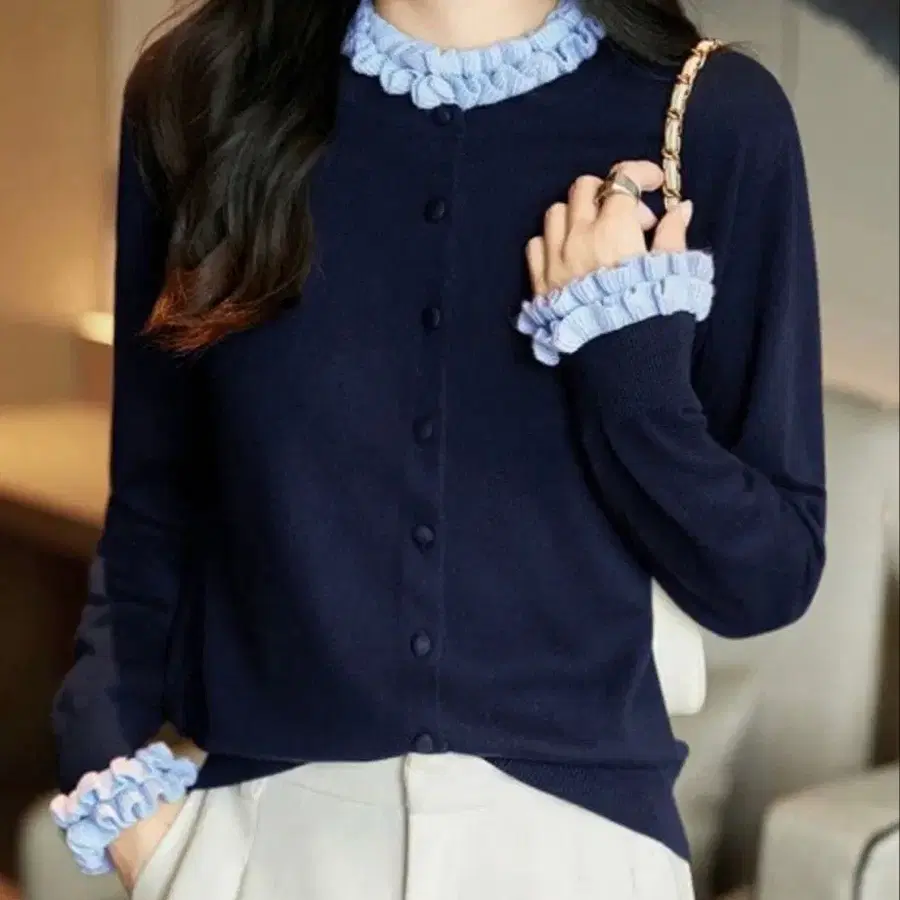프릴이 달린 네이비 색상의 긴팔 가디건입니다. 심플하고 스타일리시한 디자인. 한 번 착용한 새상품급 상태입니다. 정가 4990엔. - 색상: 네이비 - 디자인: 프릴 포함 - 사이즈: 프리 방문해 주셔서 감사합니다.