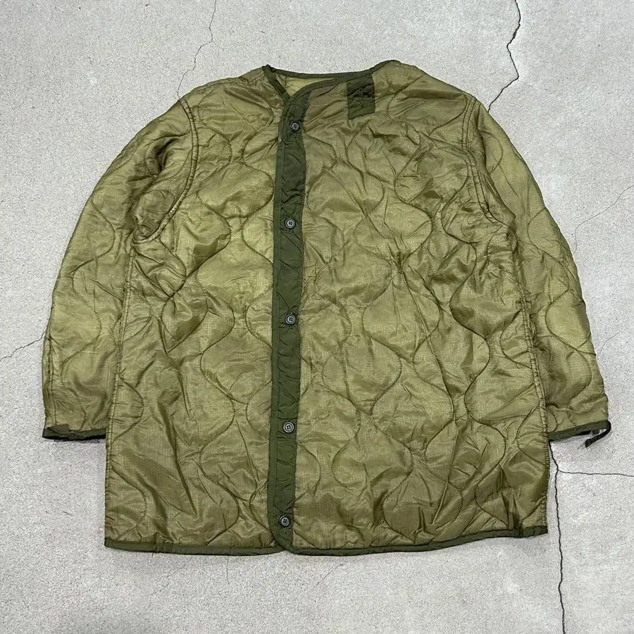 used M-65 라이너를 리메이크하여 버튼을 단 상품입니다. 뒷면에 부착되어 있어 버튼을 풀면 실제로 라이너로 사용할 수 있습니다.