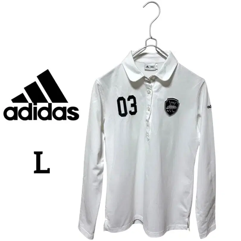화이트 색상의 긴팔 피케 셔츠, 엠블럼 부착, 03 번호.