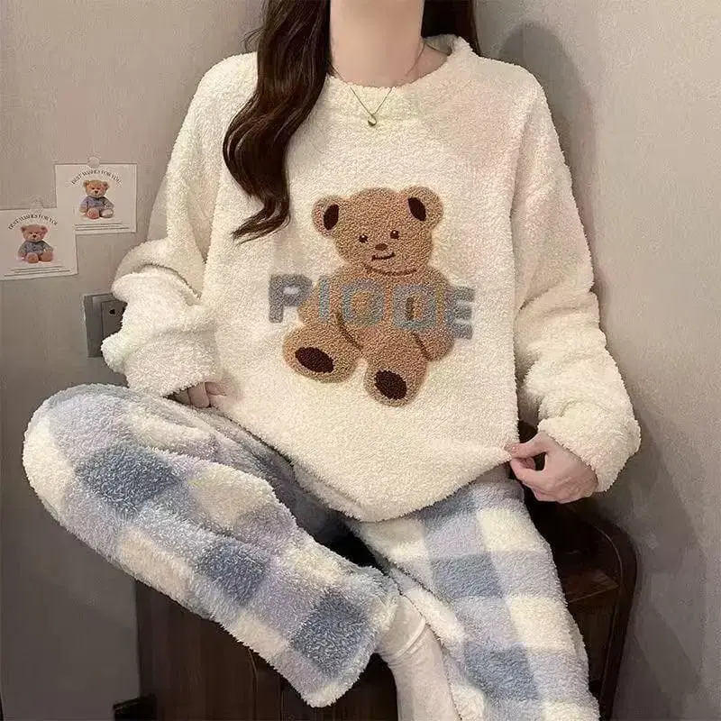 곰 파자마 여성용 가을/겨울 두꺼운 원단 보아 룸웨어 외출 가능