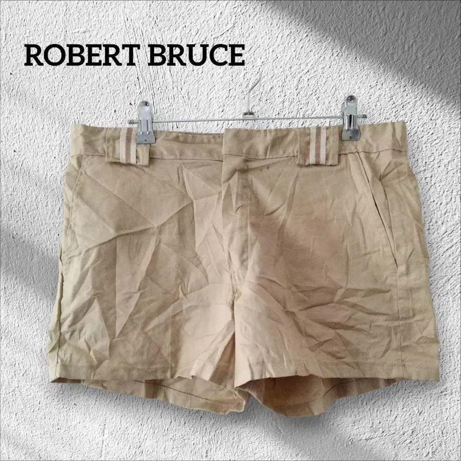 자동 번역되었어요. 원문보기베이지색 ROBERT BRUCE 숏팬츠, 허리에 스트라이프 디자인이 특징.