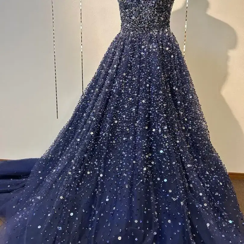 자동 번역되었어요. 원문보기비즈 장식이 더해진 네이비 색상의 스트랩리스 드레스, 풀 스커트 디자인.