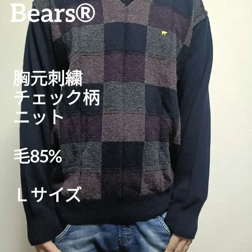 모 85% V넥 체크 무늬 니트, L 사이즈, 스타일리시한 디자인.