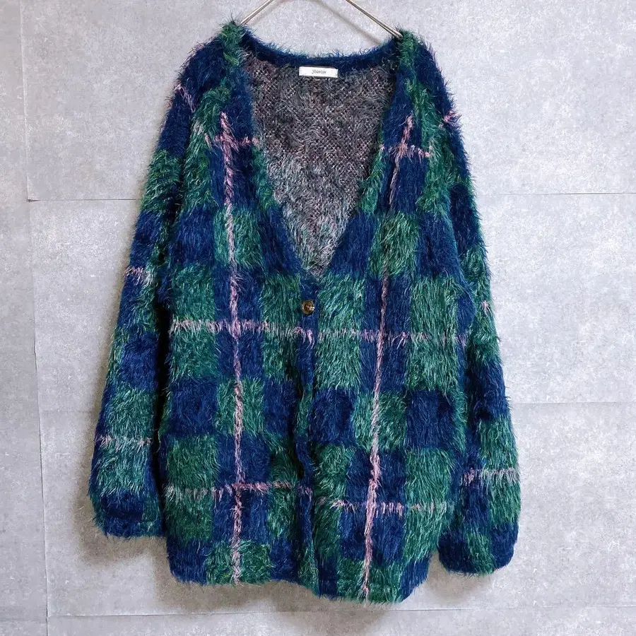자동 번역되었어요. 원문보기퍼 느낌의 부드러운 원단으로, 그린과 블루 체크 무늬가 특징인 V넥 가디건.