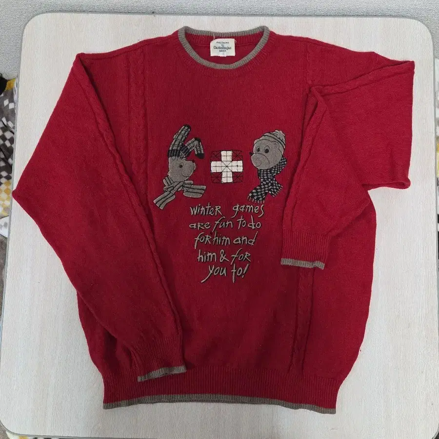 겨울 게임을 테마로 한 레드 니트 스웨터, 자수 디자인. - 브랜드: Castelbajac - 색상: 레드 - 디자인: 겨울 게임을 테마로 한 자수 - 사이즈: 3 방문해 주셔서 감사합니다.