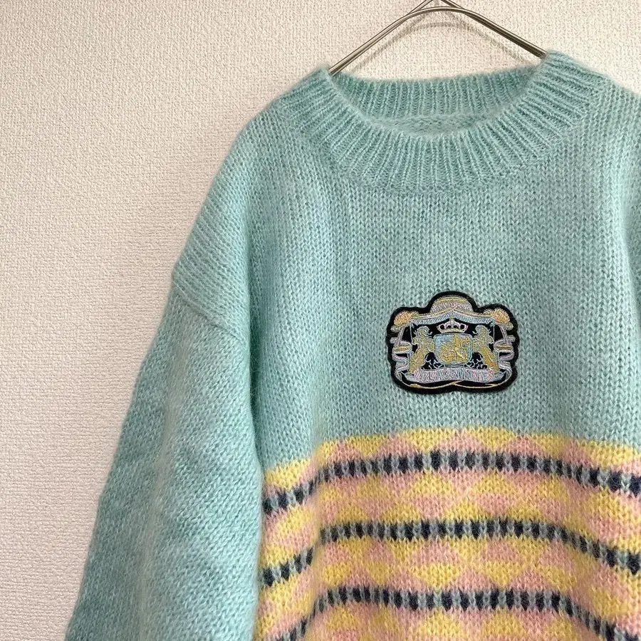 자동 번역되었어요. 원문보기민트 그린 스트라이프 패턴 니트 스웨터, 엠블럼 패치 포함.