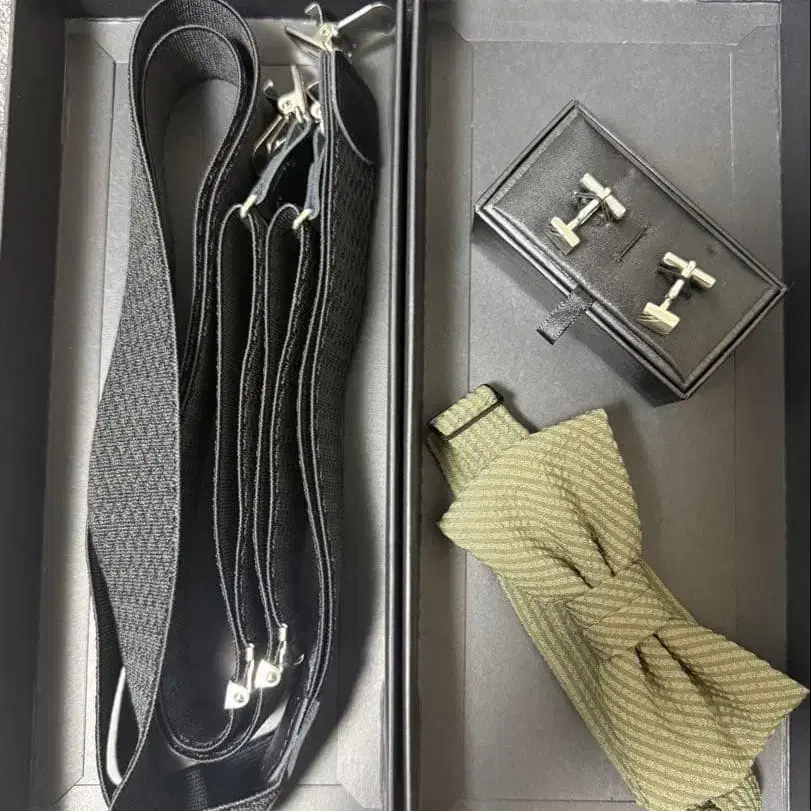 서스펜더, 커프스 단추, 나비 넥타이 세트입니다. 결혼식용으로 구매했습니다. 착용은 1회뿐입니다. 사용하기 쉬운 블랙 서스펜더 실버 커프스 단추 올리브 그린 나비 넥타이 세트로 구매 부탁드립니다. #결혼식 #신랑잡화 #나비넥타이 #서스펜더 #커프스단추