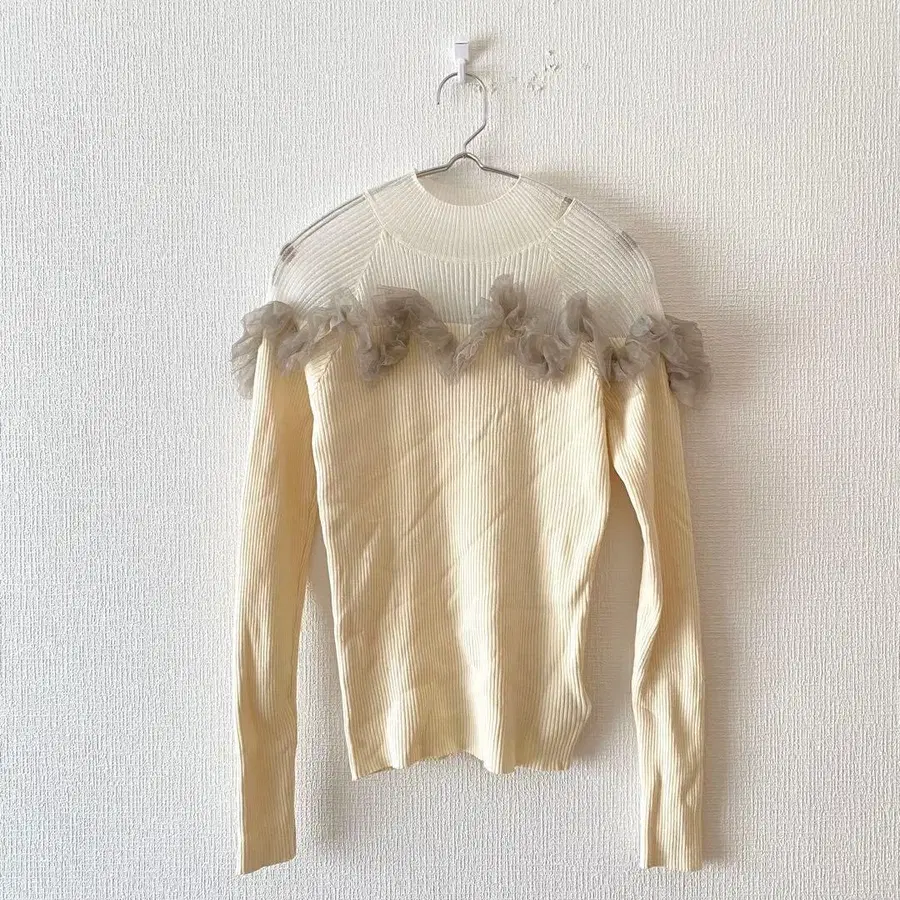 [] 리브 스웨터 가슴 부분 튤 하이넥 퍼널넥 F