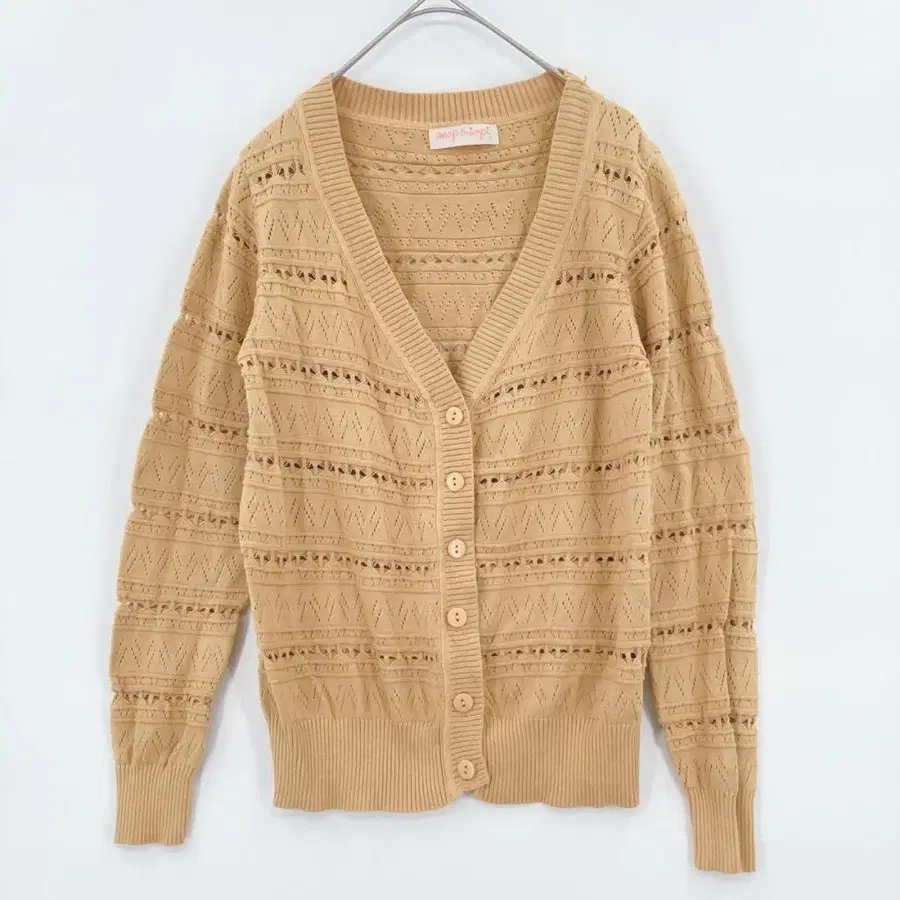 전체적으로 시스루 니트 디자인이 특징인 니트 가디건입니다. 코튼 혼방 소재로 촉감이 좋으며, 여러 시즌 동안 활용 가능합니다. 적당한 V넥과 버튼 디자인으로 깔끔한 인상을 줍니다.