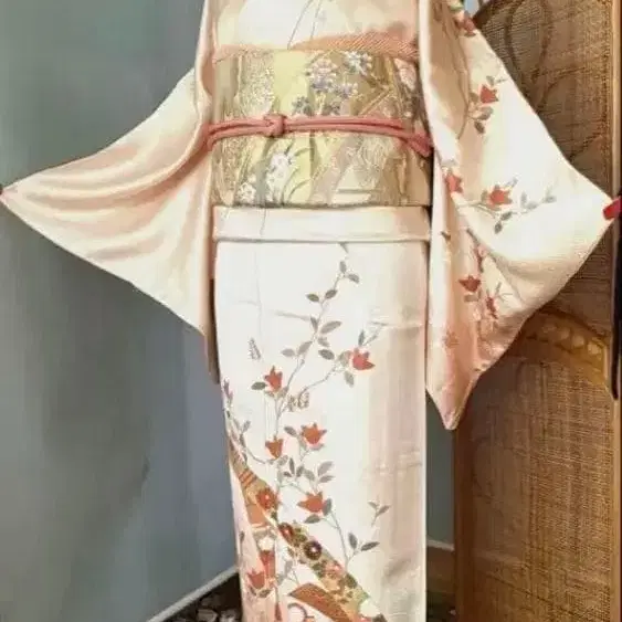 자동 번역되었어요. 원문보기라이트 핑크 그라데이션에 귤, 국화 등 사계절 꽃, 흐르는 물, 노시메가 그려진 호몬기입니다.