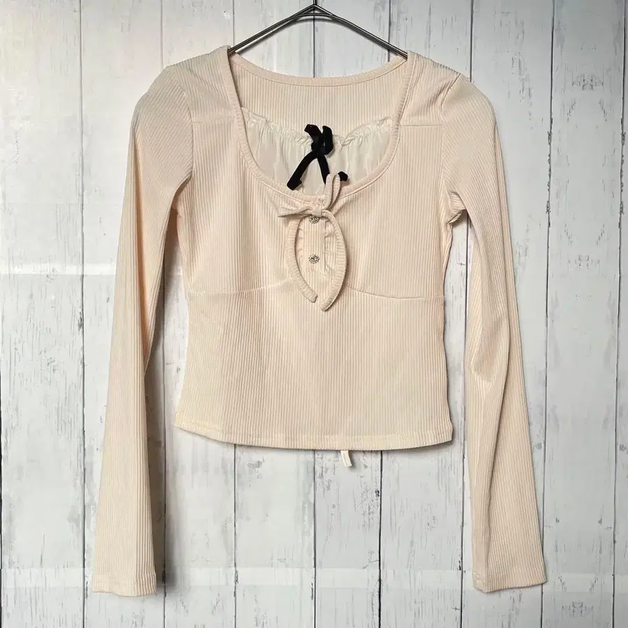 리본과 반짝이는 비쥬가 시선을 사로잡는, 성숙/러블리한 리브 상의입니다. 스퀘어 넥에 가까운 넓은 넥라인이 데콜테 라인을 예쁘게 보여주며 여성스러운 실루엣을 연출해 줍니다.