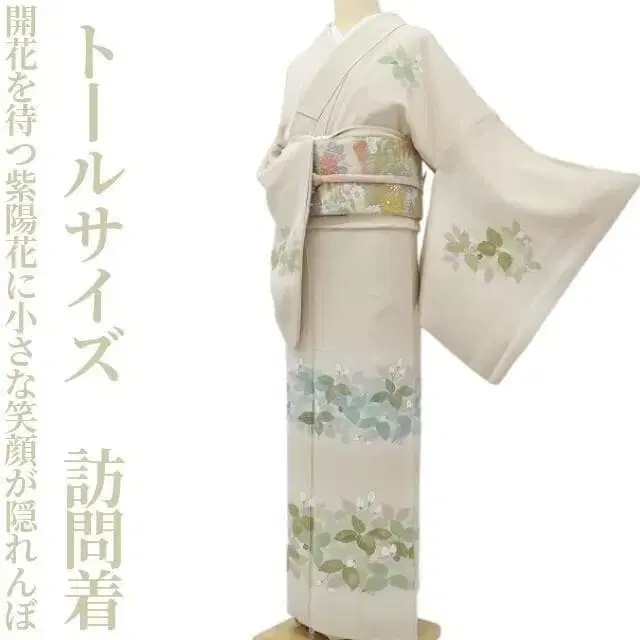 옅고 부드러운 잎사귀에 순수하고 무구한 모습을 흔들며 개화를 기다리는 수국, 숨바꼭질하는 작은 미소가 어른스러운 여유를 보여주며 앞으로 개화할 즐거움을 선사하는 순수 실크 '이중 기모노' 톨 사이즈 호몬기입니다(*^▽^*)