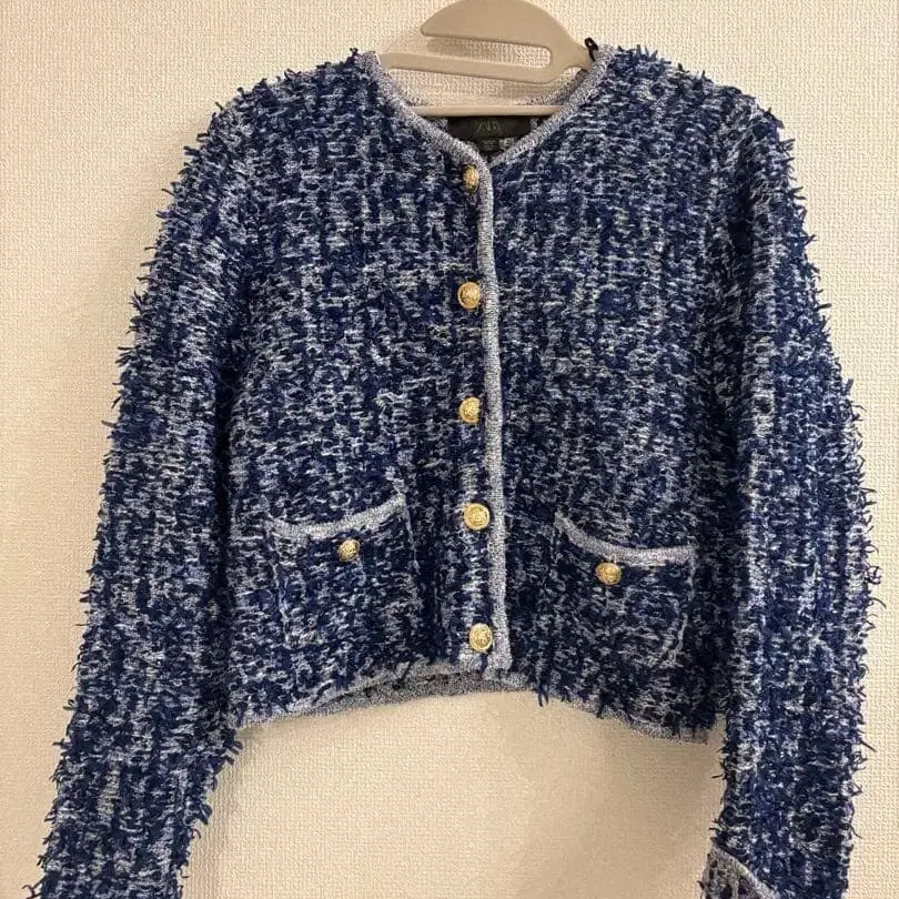 자동 번역되었어요. 원문보기네이비 계열의 트위드 소재로, 버튼과 포켓이 달린 숏 기장 가디건.