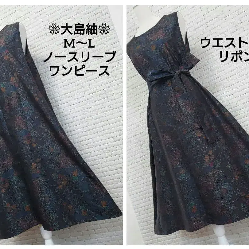 오시마 명주 기모노로 어른스럽고 귀여운 허리 리본이 달린 슬리브리스 원피스를 만들었습니다 ♡