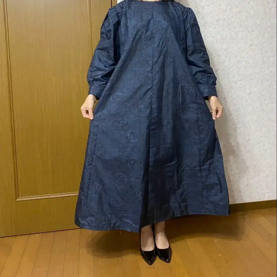 기모노 리메이크 다크 블루 꽃무늬 긴팔 롱 원피스 오시마 명주