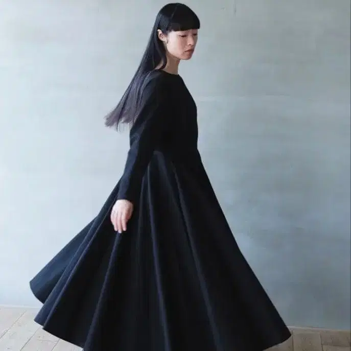 절제된 상반신과, 밑단으로 갈수록 농도를 더하는 광대한 플레어. 장식을 더하지 않고 구조만으로 존재감을 세운 [ 블랙 ] 입니다.