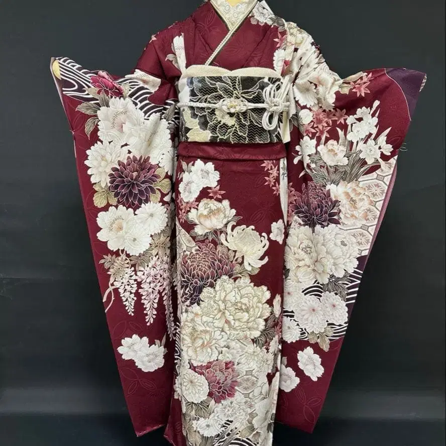 크림슨 컬러의 시크한 모란과 국화, 흐르는 물의 후리소데 풀세트