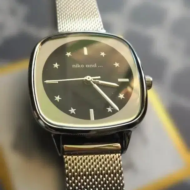 다이얼은 블랙이며 niko and 로고가 있고 벨트는 아름다운 실버 색상입니다.