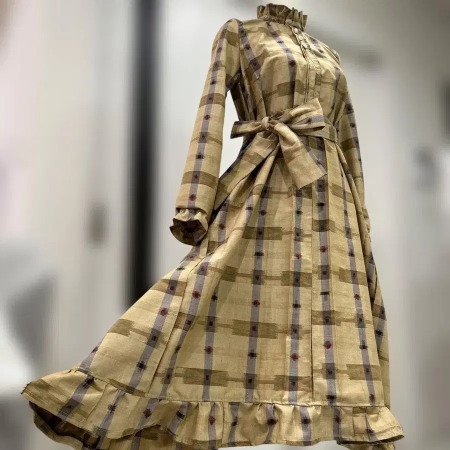 기모노 리메이크 앤틱 베이지 계열 체크 무늬 롱 드레스