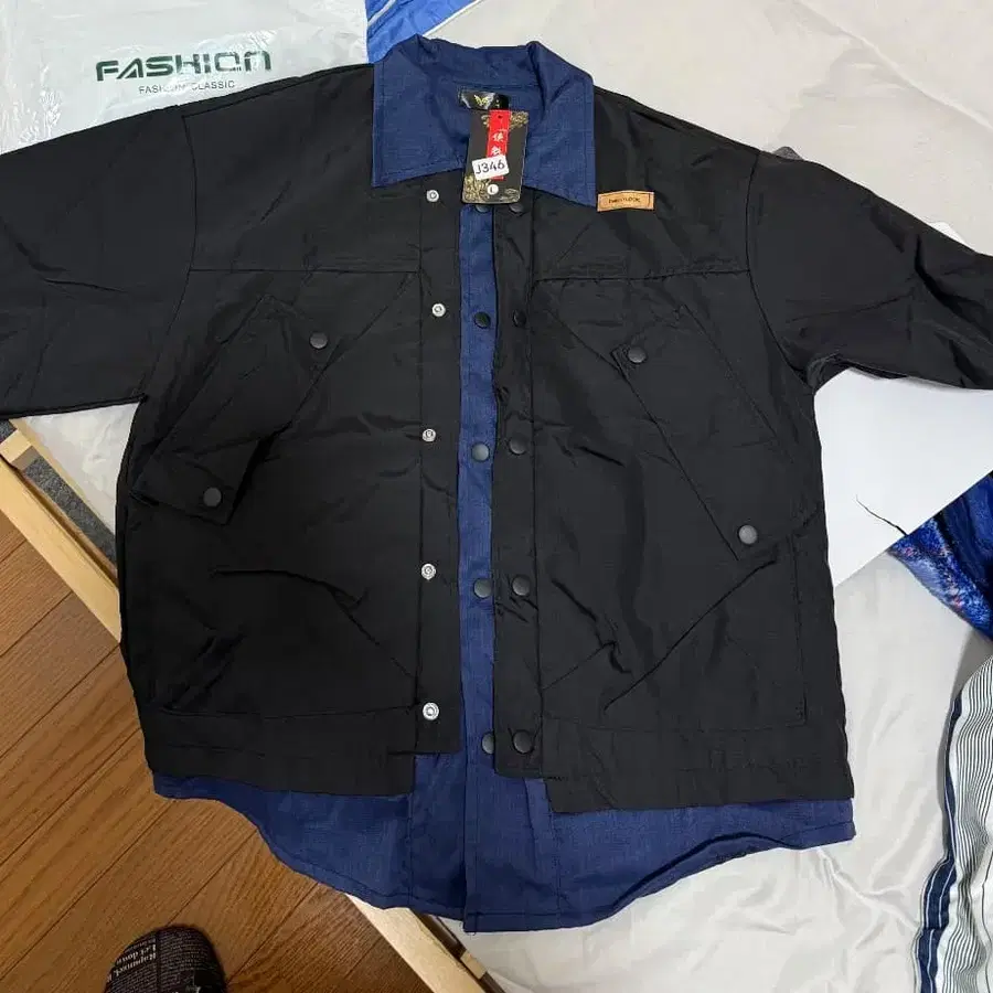 • 색상: 메인은 블랙. 옷깃과 안쪽의 페이크 레이어드 부분은 데님풍/네이비 블루의 콤비네이션 (돌려입기 쉬운 색상입니다).