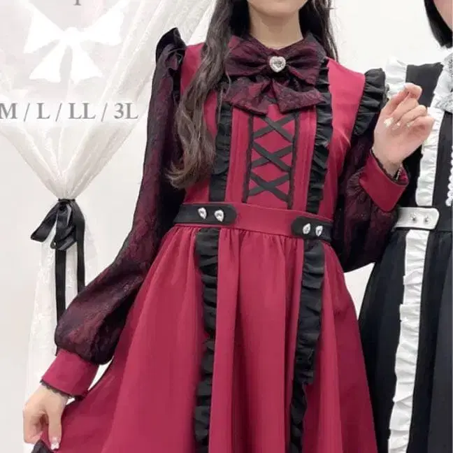유메텐보 원피스 프릴 가득 레이스업 리본 원피스 보르도 레드