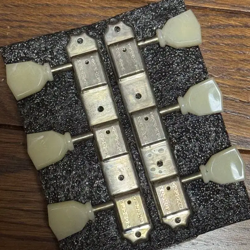 Gibson J-45 또는 J-50 등 Kluson Deluxe 3연 플레이트 페그에 나사 구멍 가공 없이 장착할 수 있습니다. 요시다 타쿠로 J-45 스타일로 어떠신가요? 에이지드 처리가 되어 있어 가지고 계신 빈티지 Gibson에 위화감 없이 장착하실 수 있습니다.