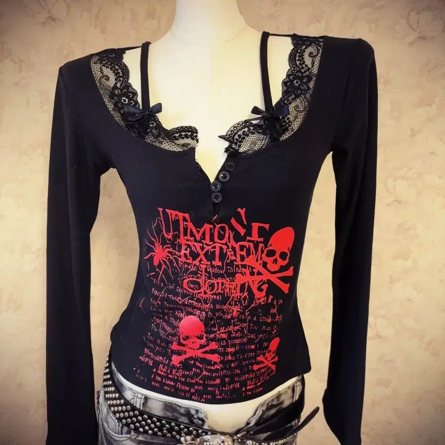 헤이세이 갸루 Y2K 스컬 프린트 긴팔 T셔츠 그런지