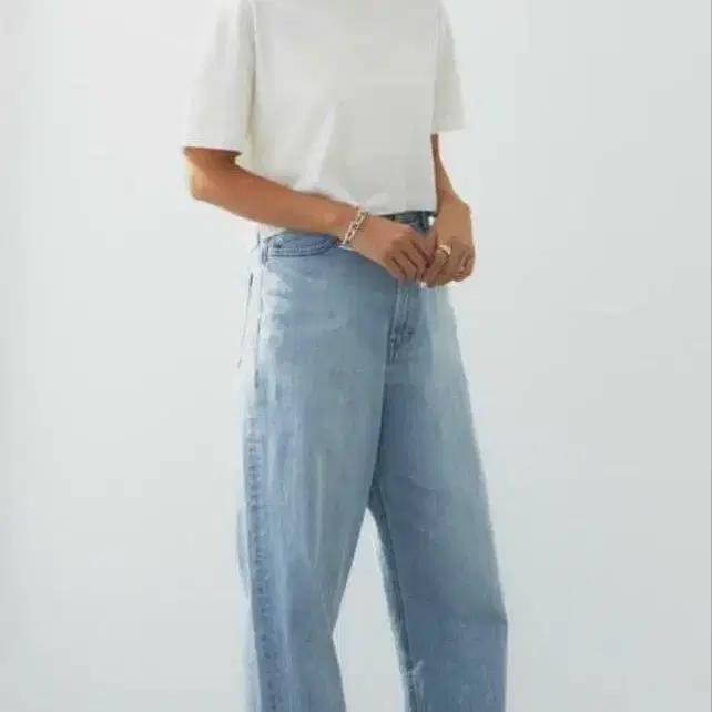 남성용 와이드 청바지를 여성이 소화하는 이미지입니다.