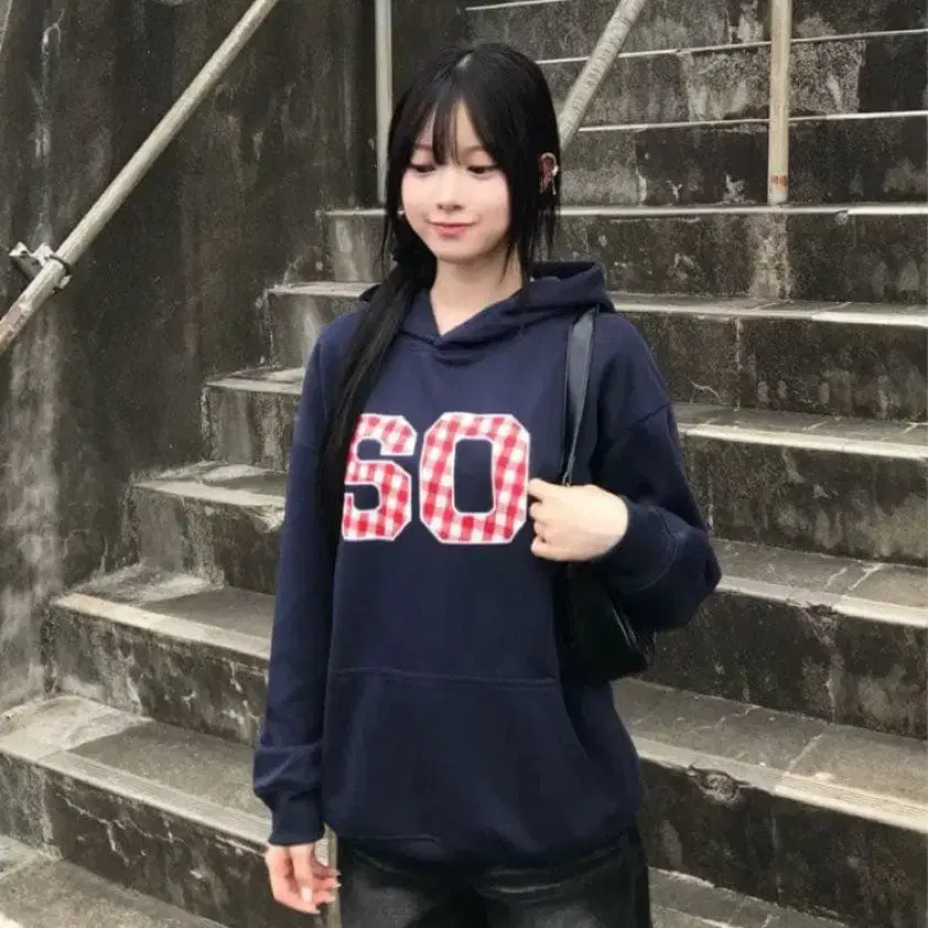 emmy 체크 로고 프린트 후드티 네이비 쉬인
