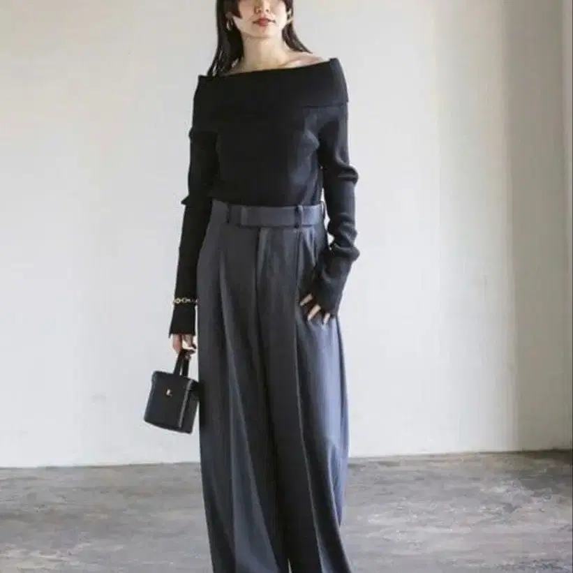 접는 디자인 부분을 조절하여 원하는 대로 하이넥 & 오프숄더 스타일로 어레인지 가능한 디자인 니트.