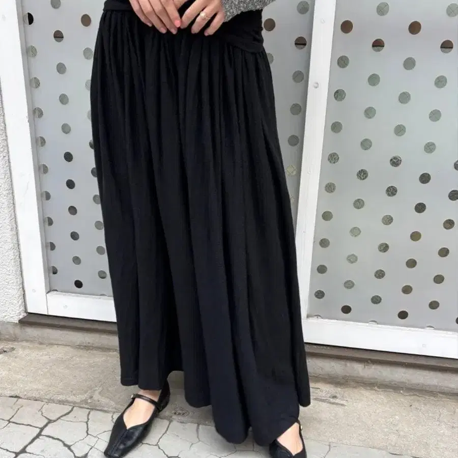 원단을 넉넉하게 사용한 니트 개더 스커트.