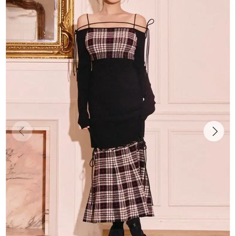 RANDY 스트링 코어 격자 무늬 머메이드 원피스