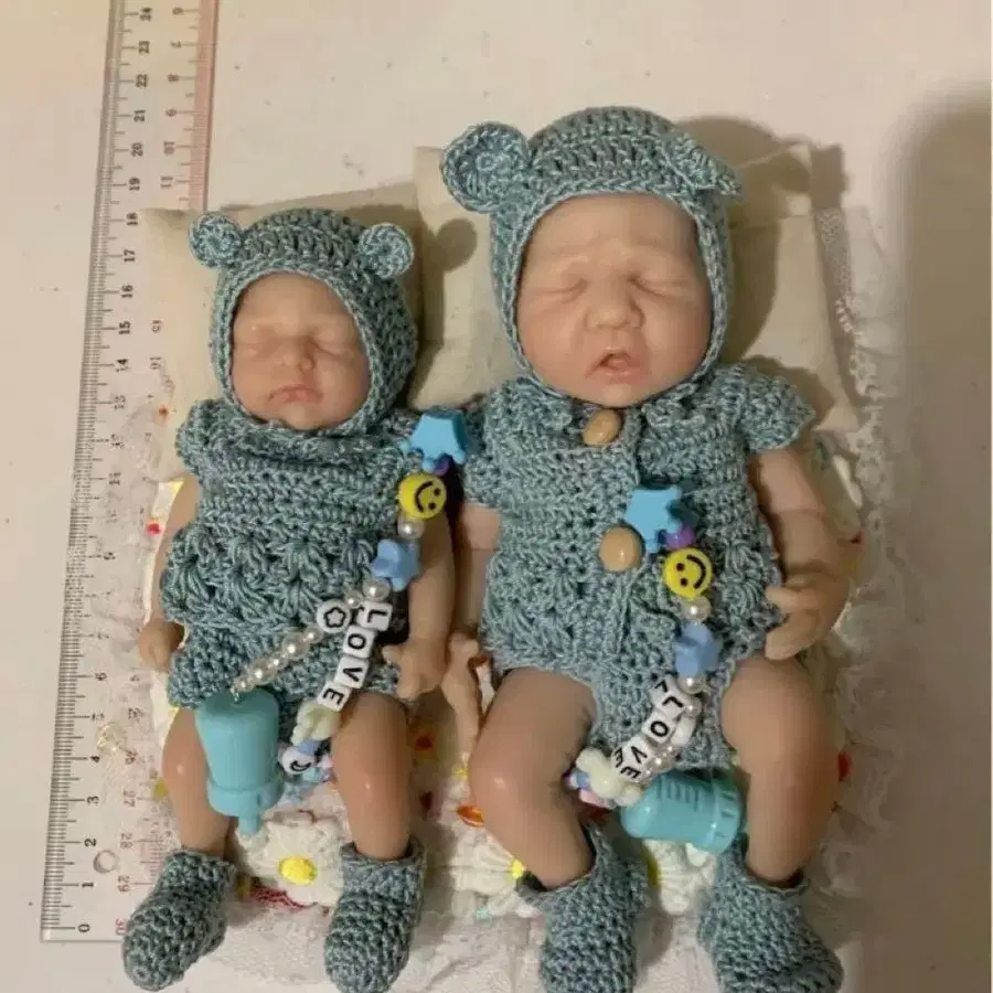풀 실리콘 리본 인형 2체 스카이블루 곰돌이 귀 달린 의상